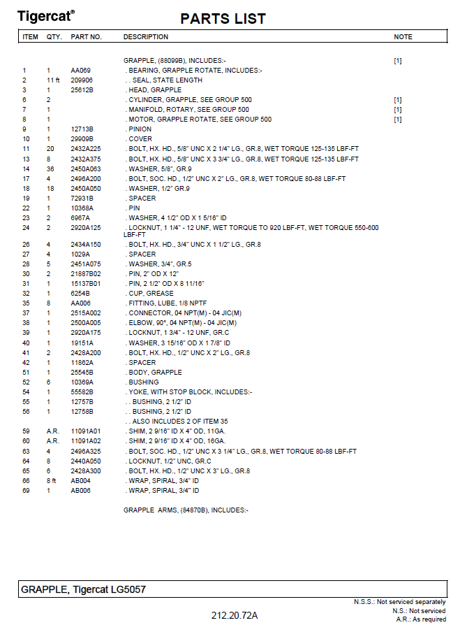TIGERCAT LG5057 LOADER GRAPPLE PARTS MANUAL