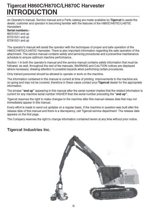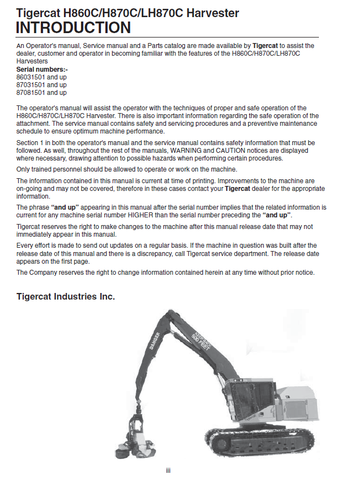 Download Complete Operator/User Manual For Tigercat LH870C Harvester | Serial No. (87081501-87082499)