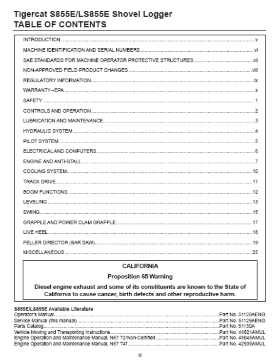 Introduction Machine Identification And Serial Numbers Sae Standards For Machine Operator Protective Structures Non-approved Field Product Changes Regulatory Information Warranty-epa Safety Controls And Operation Lubrication And Maintenance Hydraulic System Pilot System Electricaland Computers Engine And Anti-stall Cooling System Track Drive Boom Functions Leveling Swing Grapple And Power Clam Grapple Live Heel Feller Director (Sar Saw) Miscellaneous