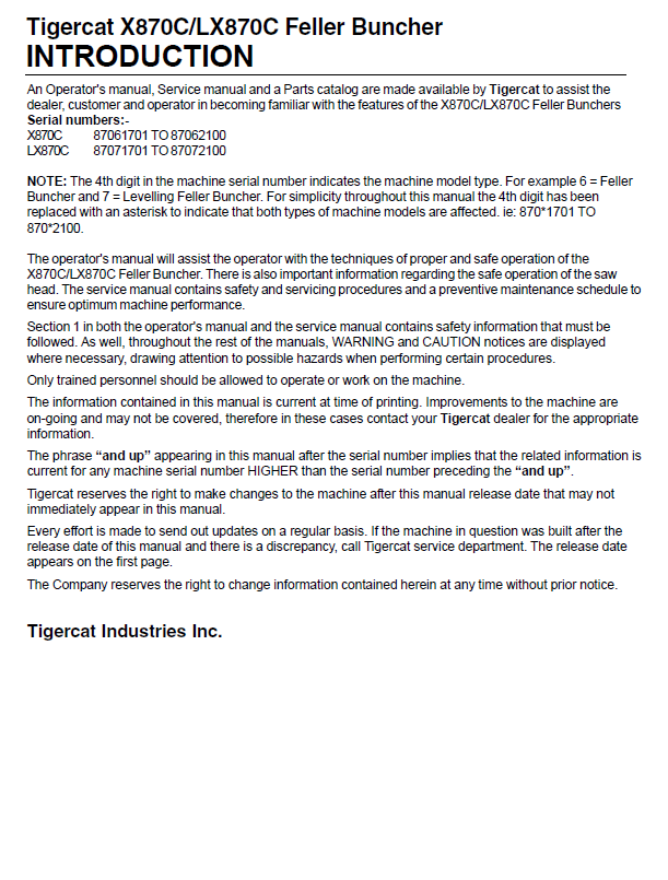 This PDF file download of the Tigercat LX870C Feller Buncher Operator/User Manual covers serial numbers 87071701-87073500 and 87071701-87072100. It provides essential information and recommendations for the safe operation, maintenance and troubleshooting of the machine.