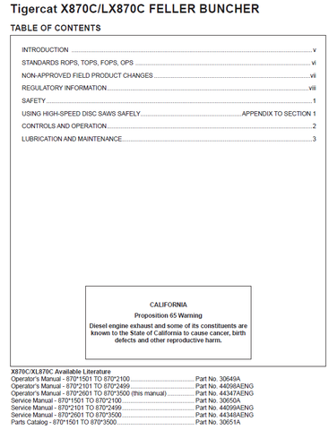 TIGERCAT LX870C FELLER BUNCHER OPERATOR/USER MANUAL (87071701-87073500, 87072601-87073500) - PDF FILE DOWNLOAD