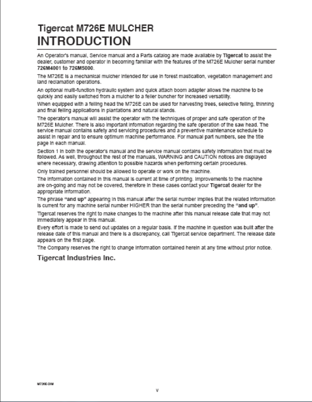 The Tigercat M726E Mulcher Operator / User Manual is an essential guide for anyone operating or maintaining the 726E model. This PDF file download provides detailed instructions and diagrams to ensure proper usage and maintenance. With this manual, you can increase safety, efficiency, and the lifespan of your mulcher.