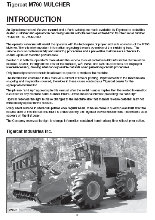 Download Complete Operator/User Manual PDF For Tigercat M760 Mulcher | Serial No. (760M0101-760M0500, 760M0101-760M0180)