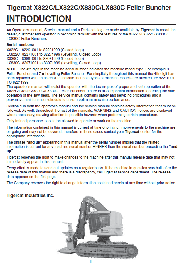 Download Complete Operator/User Manual For Tigercat X822C Feller Buncher | Serial No. (82261001-82263000, 82261001-82261999)