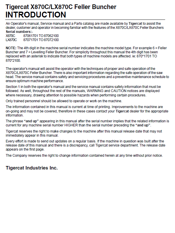 Download Complete Operator/User Manual For Tigercat X870C Feller Buncher | Serial No. (87061701-87063500, 87061701-87062100)