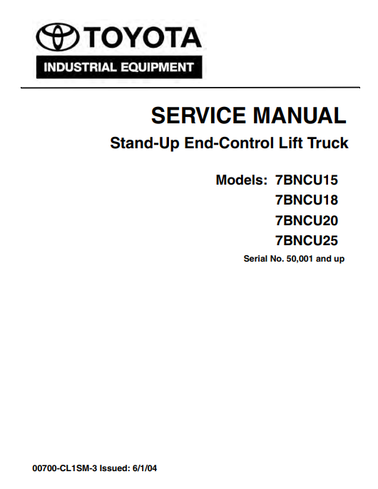 Download Complete Service Repair Manual For Toyota 7BNCU15, 7BNCU18, 7BNCU20, 7BNCU25  Stand-Up End-Control Lift Truck | Part Number- (00700-CL1SM-3) S/N- 50001 and UP