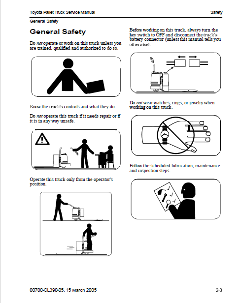 Learn how to effectively maintain and repair your Toyota 7HBW-E-C30, 7HBE-C40, 7TB50 Pallet Trucks with this comprehensive service manual. This PDF download provides valuable information to keep your forklift running smoothly, increasing its lifespan and reducing downtime. Perfect for forklift operators.