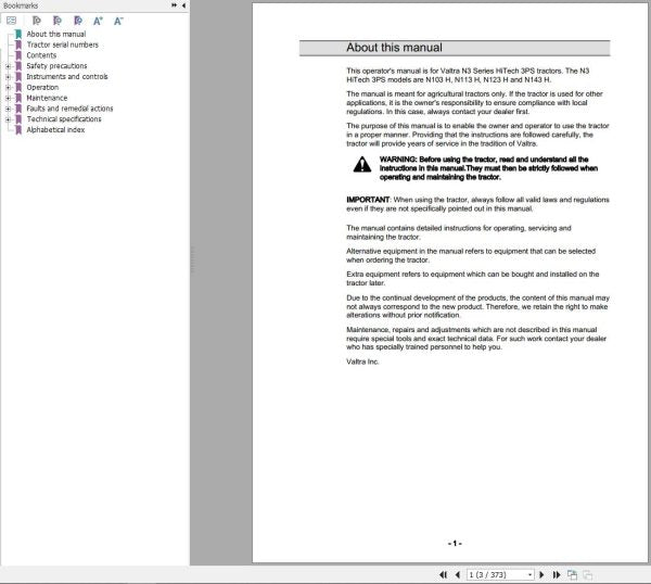 VALTRA TRACTOR N103H TO N143H OPERATOR’S MANUAL 39859214 (373 PAGES)