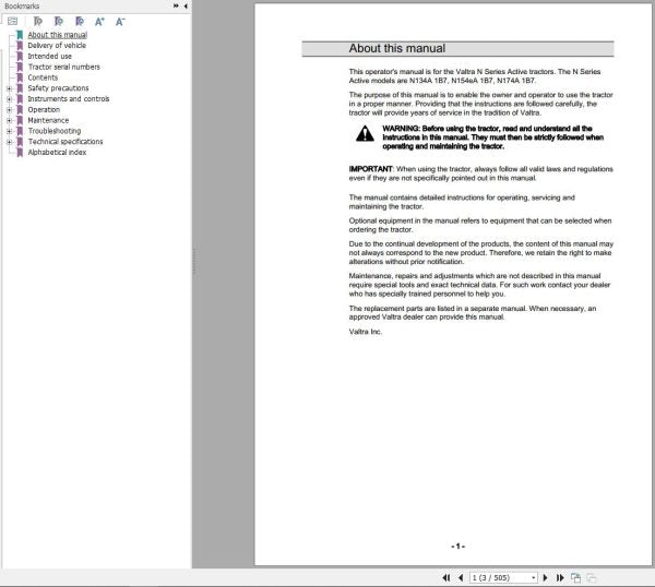 DOWNLOAD COMPLETE OPERATOR’S MANUAL FOR VALTRA TRACTOR N134A1B7, N1154EA1B7, N174A1B7 - PDF FILE