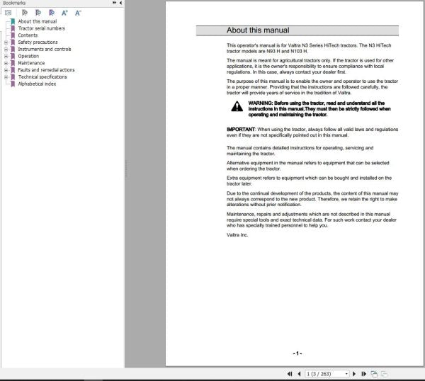 DOWNLOAD COMPLETE OPERATOR’S MANUAL FOR VALTRA TRACTOR N93H, N103H - PDF FILE