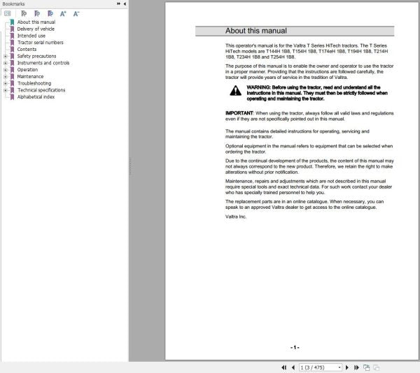 DISCOVER THE ESSENTIAL VALTRA TRACTOR T144H1B8 TO T254H1B8 OPERATOR’S MANUAL, NOW AVAILABLE IN A CONVENIENT PDF FORMAT. THIS COMPREHENSIVE GUIDE IS DESIGNED TO ENHANCE YOUR UNDERSTANDING AND OPERATION OF YOUR VALTRA TRACTOR, ENSURING YOU GET THE MOST OUT OF YOUR INVESTMENT.