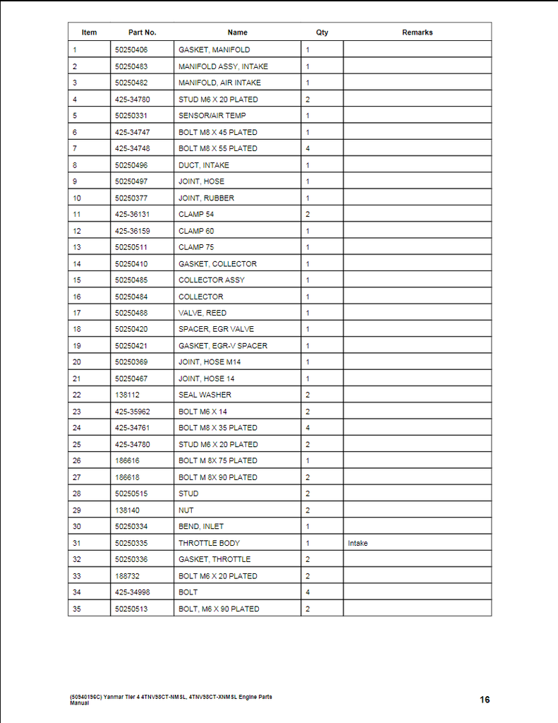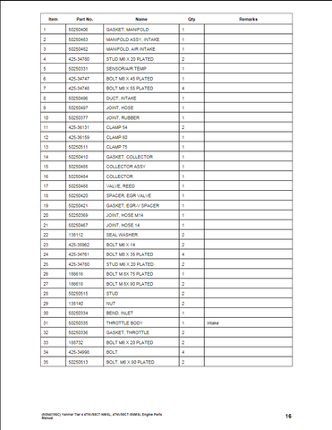 Yanmar Tier 4 4TNV98CT-NMSL, 4TNV98CT-XNMSL Engine Parts Manual