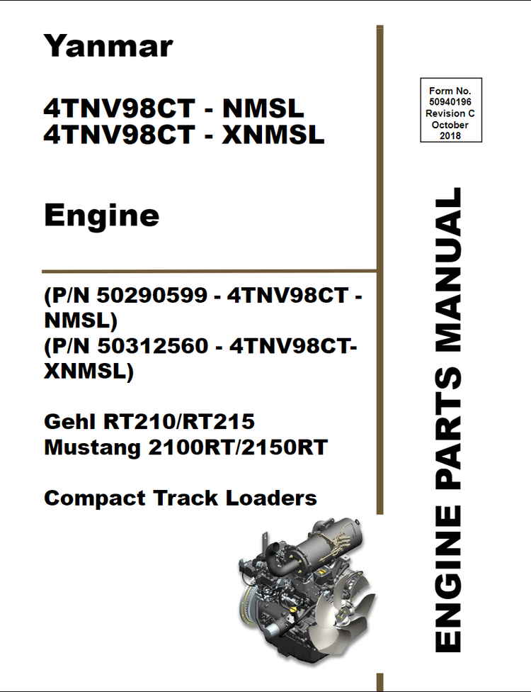 This Yanmar Tier 4 4TNV98CT-NMSL and 4TNV98CT-XNMSL Engine Parts Catalog Manual (50940196C) provides an in-depth look at the essential operating components of the Yanmar Tier 4 4TNV98CT-NMSL and 4TNV98CT-XNMSL engines. Loaded with diagrams and technical specs, this comprehensive resource is essential for maintenance and repair professionals working on Gehl RT210/RT215 Mustang 2100RT/2150RT Compact Track Loaders.