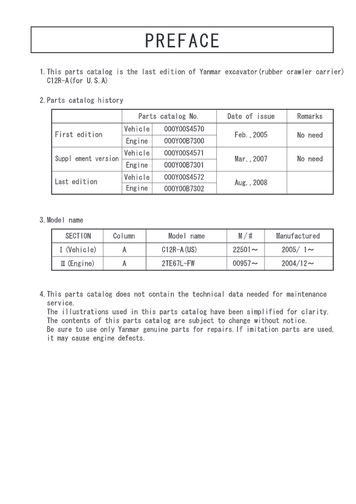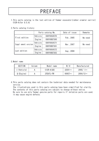 Download Complete Parts Catalogue Manual For Yanmar C12R-A Excavator (Rubber Crawler Carrier) | Part Number - 0CS10-G45702 Published 2011/9 (Sep.) (for U.S.A.)