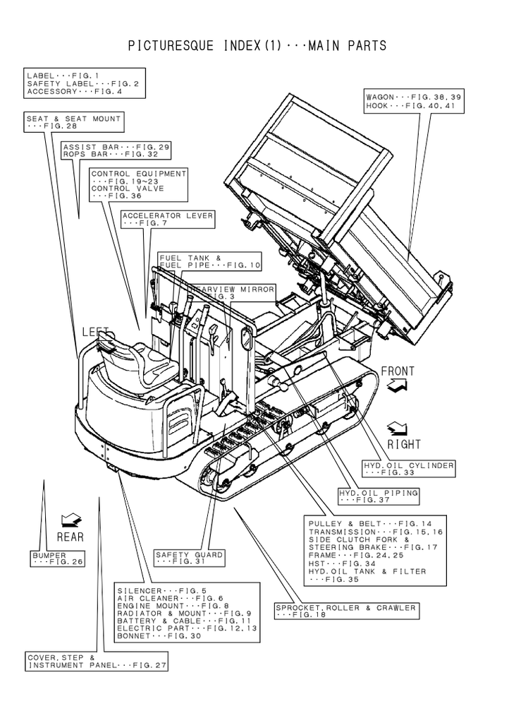 1. LABEL 2. SAFETY LABEL 3. REARVIEW MIRROR 4. ACCESSORY 5. SILENCER 6. AIR CLEANER 7. ACCELERATOR LEVER 8. ENGINE MOUNT 9. RADIATOR & MOUNT 10. FUEL TANK & FUEL PIPE 11. BATTERY & CABLE 12. ELECTRIC PART(WIRING) 13. ELECTRIC PART(EQUIPMENT) 14. PULLEY & BELT 15. TRANSMISSION(CASE) 16. TRANSMISSION(SHAFT & GEAR) 17. SIDE CLUTCH FORK & STEERING BRAKE 18. SPROCKET, ROLLER & CRAWLER 19. CONTROL EQUIPMENT(F.R. LEVER) 20. CONTROL EQUIPMENT(TRAVEL PEDAL) 21. CONTROL EQUIPMENT