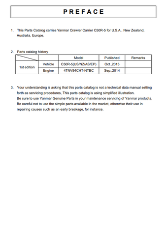 This parts catalogue manual provides technical data and guidance needed to correctly select and order Yanmar C50R-5 Excavator components. It contains detailed illustrations, diagrams, and instructions for assembly and disassembly to ensure correct and reliable operation. Have the confidence to keep your excavator running smoothly.