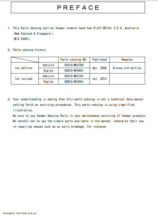 YANMAR VIO27-5B EXCAVATOR PARTS CATALOGUE MANUAL 0CS10-M52701_EN - PDF FILE